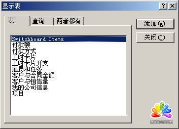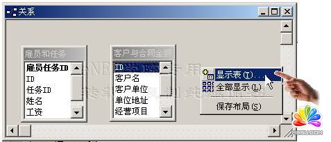 如果需要添加的關(guān)系表沒有在“關(guān)系”對話框中列出,那么就需要進(jìn)入“顯示表”對話框,為此可以右擊“關(guān)系”對話框中任意處,然后從一份快捷菜單中選擇“顯示表”命令,參圖41。接下來就可以在這個(gè)對話框的“表”選項(xiàng)卡中選擇要加入的表,然后單擊“添加”按鈕。下面的操作將使用“雇員和任務(wù)”、“客戶與銷售量”、“客戶與合同金額”這三張數(shù)據(jù)表,它們?nèi)际窃诖酥敖⒌模斎氲臄?shù)據(jù)記錄也很簡單,各字段如圖42所示,您可以自己建立好。
