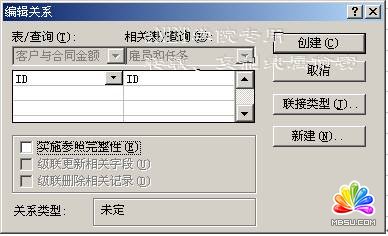 若要拖動(dòng)多個(gè)字段,可在拖動(dòng)之前按下鍵盤上的Ctrl鍵并單擊每一個(gè)要拖動(dòng)的字段,這樣即可選它們。在大多數(shù)的情況下,中文Access 2000要求將表中的主鍵字段(以粗體文本顯示)拖動(dòng)到其他表中的名為外部鍵的相似字段(經(jīng)常具有相同的名稱),如圖42中就顯示出各表中那個(gè)都有的ID字段。相關(guān)字段不需要有相同的名稱,但它們必須有相同的數(shù)據(jù)類型(只有兩種例外的情況),以及包含相同種類的內(nèi)容。此外,當(dāng)匹配的字段是“數(shù)字”字段時(shí),它們必須有相同的“字段大小”屬性設(shè)置。匹配數(shù)據(jù)類型的兩種例外情況是:
