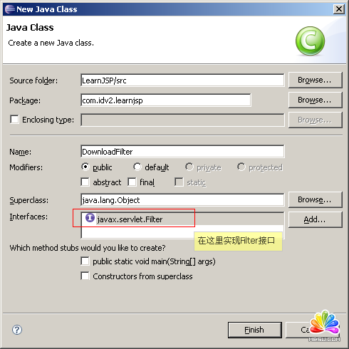 創建Filter時可惜不能像Servlet那樣,直接從右鍵菜單中選擇新建, 而只能先寫好源代碼然后手工添加到web.xml中。 如下圖,在新建類時注意要實現javax.servlet.Filter接口。