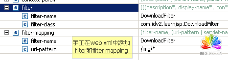 寫完代碼之后,打開web.xml文件,手工添加Filter。與Servlet類似,你需要添加 和 兩個標記。這里我們要對 /img/ 下的所有文件進行登錄驗證, 因此的 url-pattern 處我們填寫了 /img/* 。