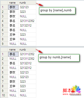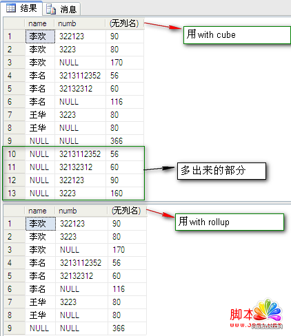 select [name],numb,sum(fenshu) from dbo.PeopleInfo group by [name],numb with cube --3,用with cube。這三種情況的比較