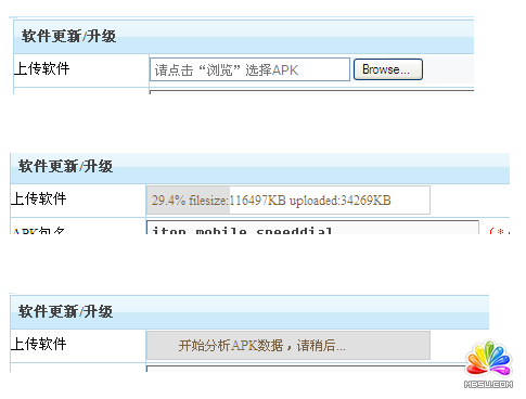 上傳APK,顯示上傳進(jìn)度條,上傳完成開(kāi)始分析APK,并顯示:正在分析apk數(shù)據(jù),請(qǐng)稍后... ,分析完成后,顯示:上傳成功,重新上傳