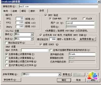 不知道是為什么原因,只有在SMTP驗證處輸入建立的賬戶名,而且不能帶@mail.com才能通過mail服務器的認證,這個是我也很迷惑的地方,希望有此經驗的人能指點一下,謝謝。