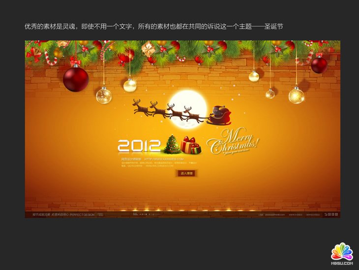 這個頁面用的素材很多,但是再多的素材也都是一個調調。例如地面的積雪,遠處的松樹,還有女孩手上的燈籠,質感都是相近的。