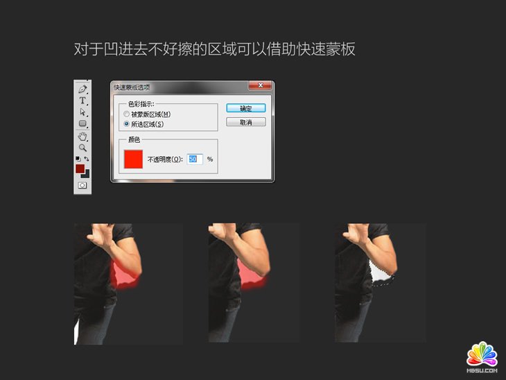 對于對于凹進去不好擦的區域可以借助快速蒙板來擦除。