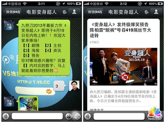 包括即將上映的《電影變身超人》的微信公眾號(hào):bscrfilm 也是如此,盡量的讓用戶通過(guò)菜單對(duì)影片進(jìn)行了解參與互動(dòng)活動(dòng)。您可以看下圖即可明白。