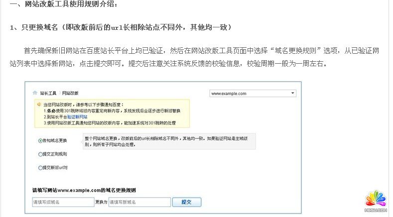 其次,網站進行復雜改版的時候,域名更換可以,但是要是能保持網站的title、關鍵詞、描述之類的能保留的盡量不要改動,雖然現在百度平臺發布了很多對于這塊改版的升級,但是個人覺得不到萬不得已,最好不要對于這些做出更改,畢竟搜索引擎對于熟悉的更有好感。但是由于升級改版工具,提交復雜改版域名的時候,我們就可以很好的利用提交正則規則方式了。畢竟大量目錄級別的鏈接跳轉是一個非常大的優勢。