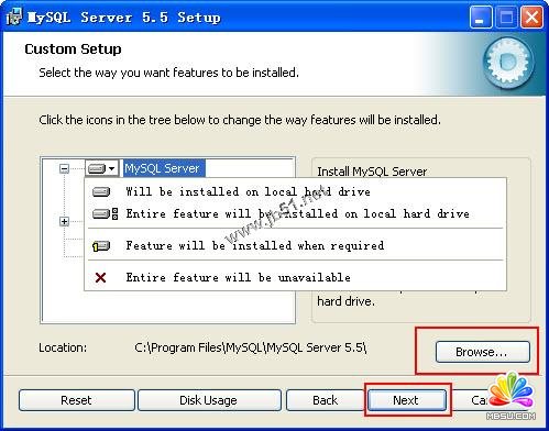 MySQL默認的安裝路徑為“C:\Program Files\MySQL\MySQL Server 5.5\”,如果想要更改安裝的路徑,可以單擊安裝路徑右側的Browse按鈕來更改默認安裝路徑。