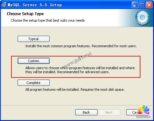 4、打開Choose Setup Type對話框,在其中列出了3中安裝類型,分別是Typical、Custom和Complete。如果選擇Typical或Complete這兩種安裝方式,將進入確認對話框,確認選擇并開始安裝。如果選擇Custom,將進入Custom(自定義)對話框。在這里選擇Custom,單擊Custom按鈕,如圖所示: