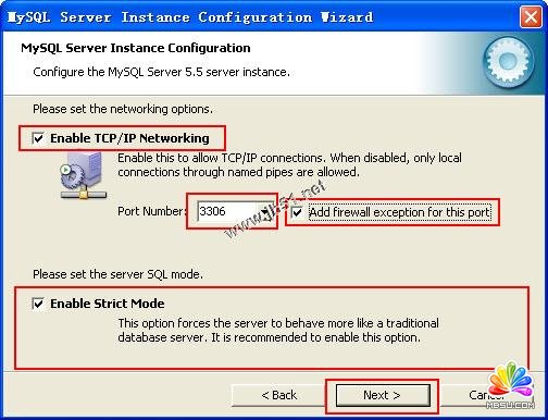 7、單擊Next按鈕,進入設置網絡選項對話框,在Networking Options對話框中可以啟用或禁用TCP/IP網絡,并配置用來連接MySQL服務器的端口號,默認情況下啟用TCP/IP網絡,默認端口為3306,要想更改訪問MySQL使用的端口,從下拉列表中選擇一個新端口或直接向下拉列表框中輸入新的端口好,但要保證選擇的端口號沒有被占用。如果選擇Add firewall exception for this port復選框,防火墻將允許通過該端口訪問,在這里選中該選項。如果選中Enable Strict Mode選項,MySQL會對輸入的數據進行嚴格的校驗,我個人認為選中是一個好的選擇,這樣可以嚴格的遵守MySQL的規則,可以養成一個好習慣,如圖所示: