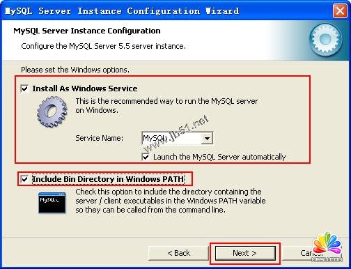 9、單擊Next按鈕,進入用于設置Windows選項的對話框,在這里可以選擇將MySQL安裝為Windows服務,并制定服務名稱,并允許命令行,設置了允許命令行后,就可以用命令行去操作MySQL了,如圖所示: