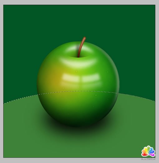建立新層命名為“蘋果”,用橢圓選區工具,按如下圖形拖出選區。選擇漸變工具,選取由前景色到背景色的徑向漸變。前景色為:#88cc33,背景色:#005522,按如下方式填充選區。# n9 W1 c2 {1 M, d M9 L1 {