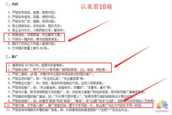 第二、關于發布的軟文標題和內容的獲取,一定要先去看一點資訊的后臺用戶規則發文規范,在人家的地盤上做廣告合理利用規則是必須的,不然你早晚會進小黑屋。標題黨還是要有的但是不能過分,建議直接去扒同行修改,不然人家都沒興趣點擊看你再好的內容后期就沒勁了。重點要說的還是內容方面,一點資訊是可以做推廣的,但是請先認真看下圖中的規標紅位置,認真看10遍!