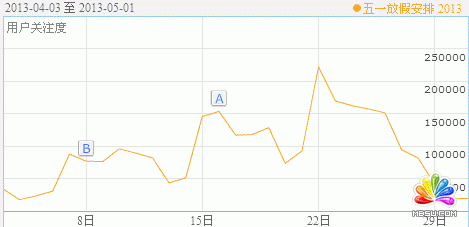 據觀察,搜索比較多的是“五一放假安排2013”,由圖中數據可以看出,指數高達25萬!