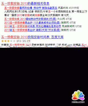 我們就從“五一放假安排2013”這個詞作為突破口,我們可以看到排名第一位的是百度網頁應用,這個我們就不提了,剩下的是新聞、百度文庫以及高權重的個人網站。對于這一塊,想百度自己的產品還有新聞我們站長就不要打小算盤了,更有一些站長為了節日單獨做了幾個網站,我覺得可以嘗試,但是耗費的經歷也頗大.