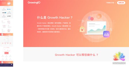 以Growinglo為例,這是我常用的一個數據分析統計工具。在國外用的比較多,但是價格不菲。大家看一下這個頁面,其實是一個落地頁面,我們分用戶觸達、用戶號召、用戶展示,右邊是一個大圖,左邊切了幾個小圖。