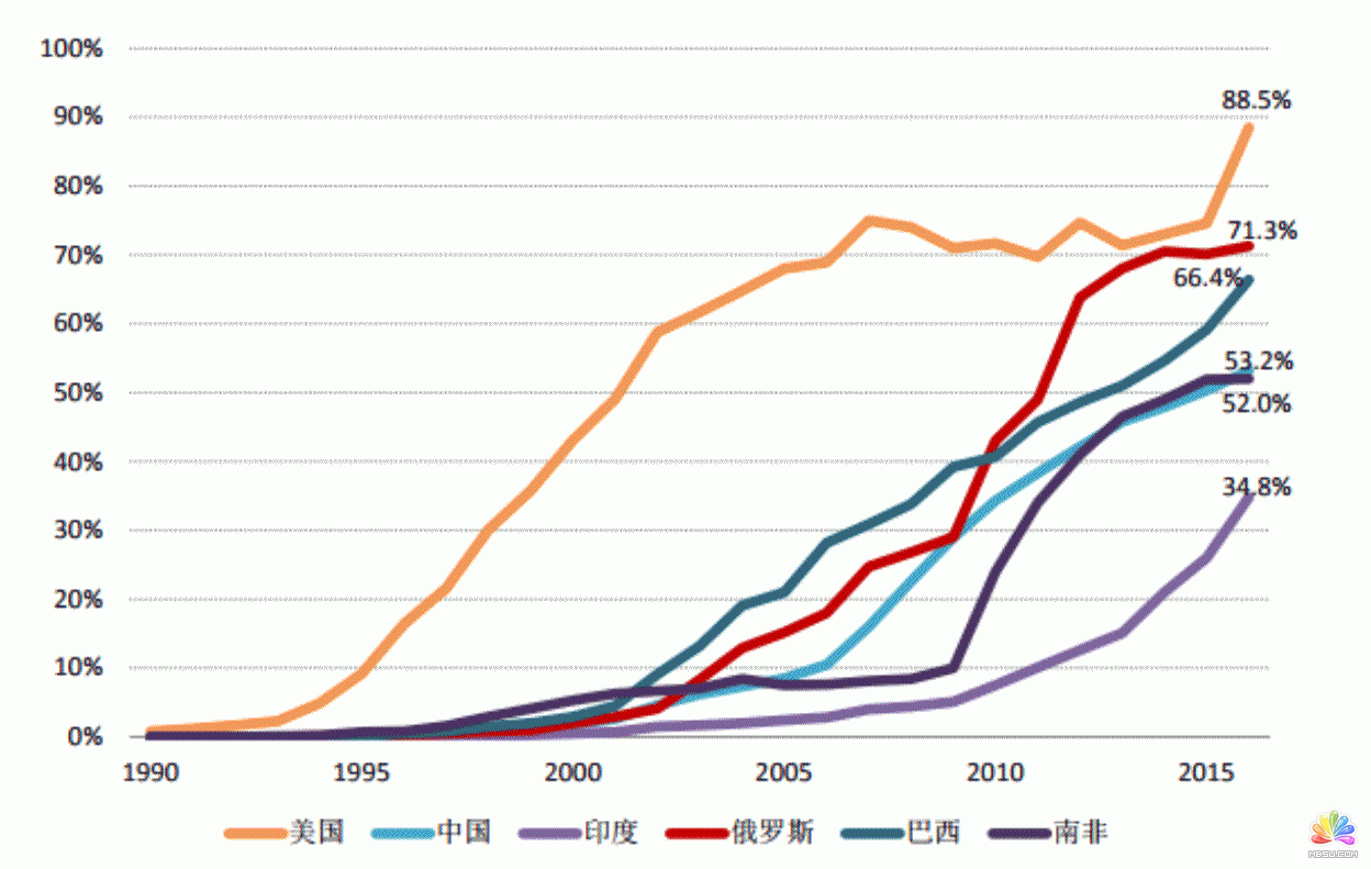金磚國(guó)家與美國(guó)互聯(lián)網(wǎng)滲透率比較,數(shù)據(jù)來(lái)源:世界銀行、CNNIC、internet live stats